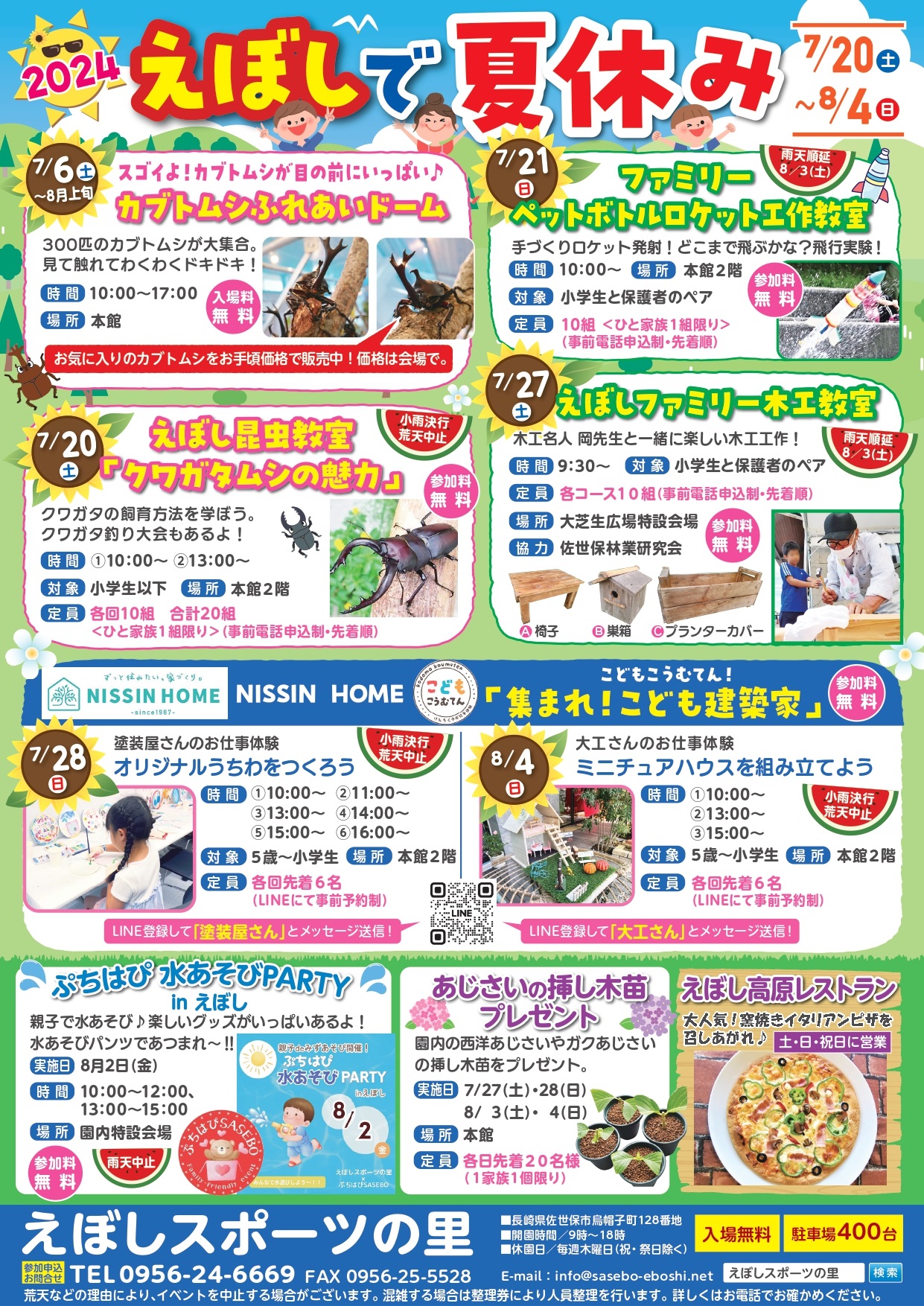 毎年夏休み期間中に行われ、多彩なイベントや、体験教室なども目白押し!毎年恒例、自由研究にぴったりの「ファミリー木工作教室」「ファミリーペットボトルロケット工作教室」や、昆虫・植物の教室が開催されます。夏休みの思い出作りに、ご家族そろってえぼしスポーツの里にお出かけください♪