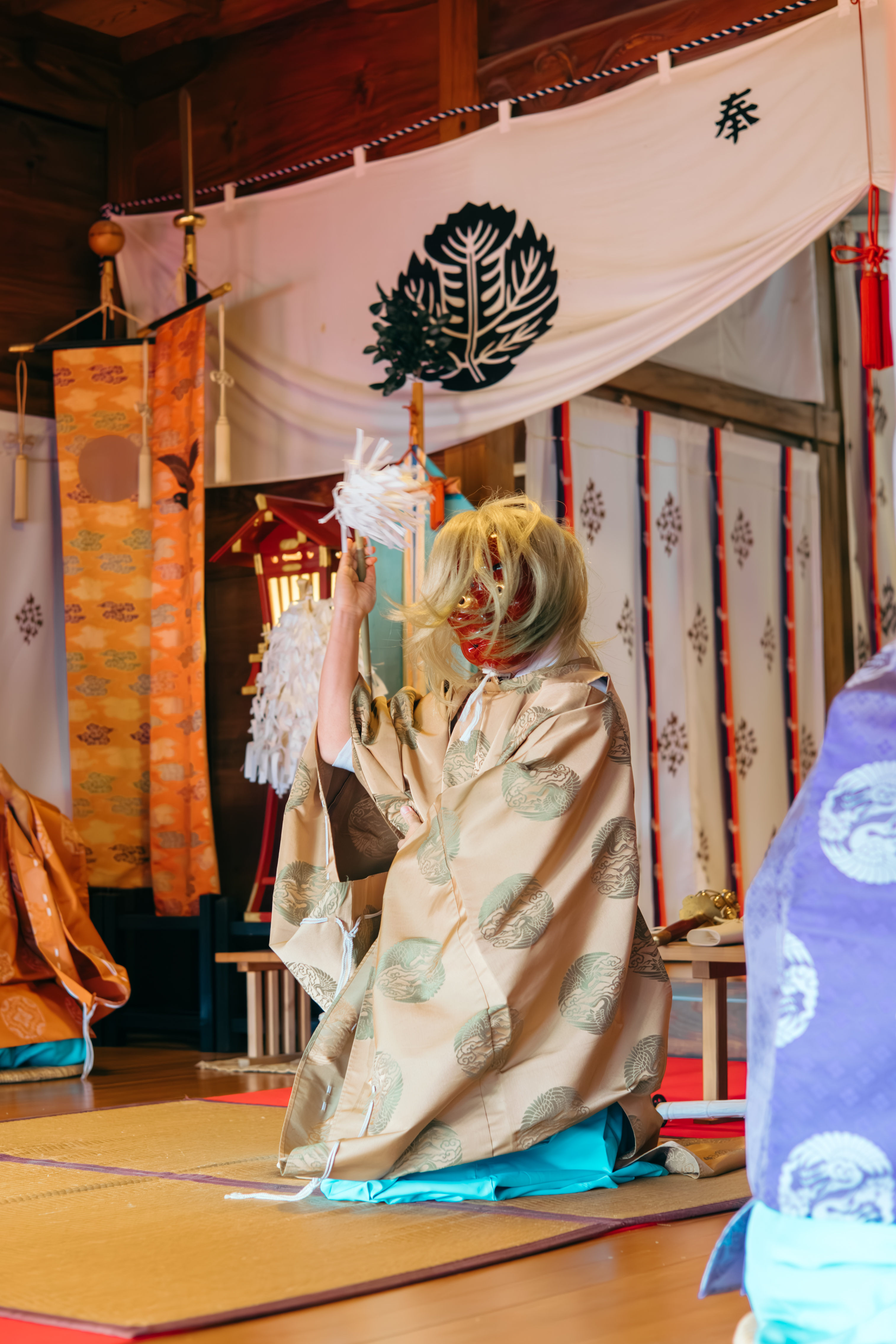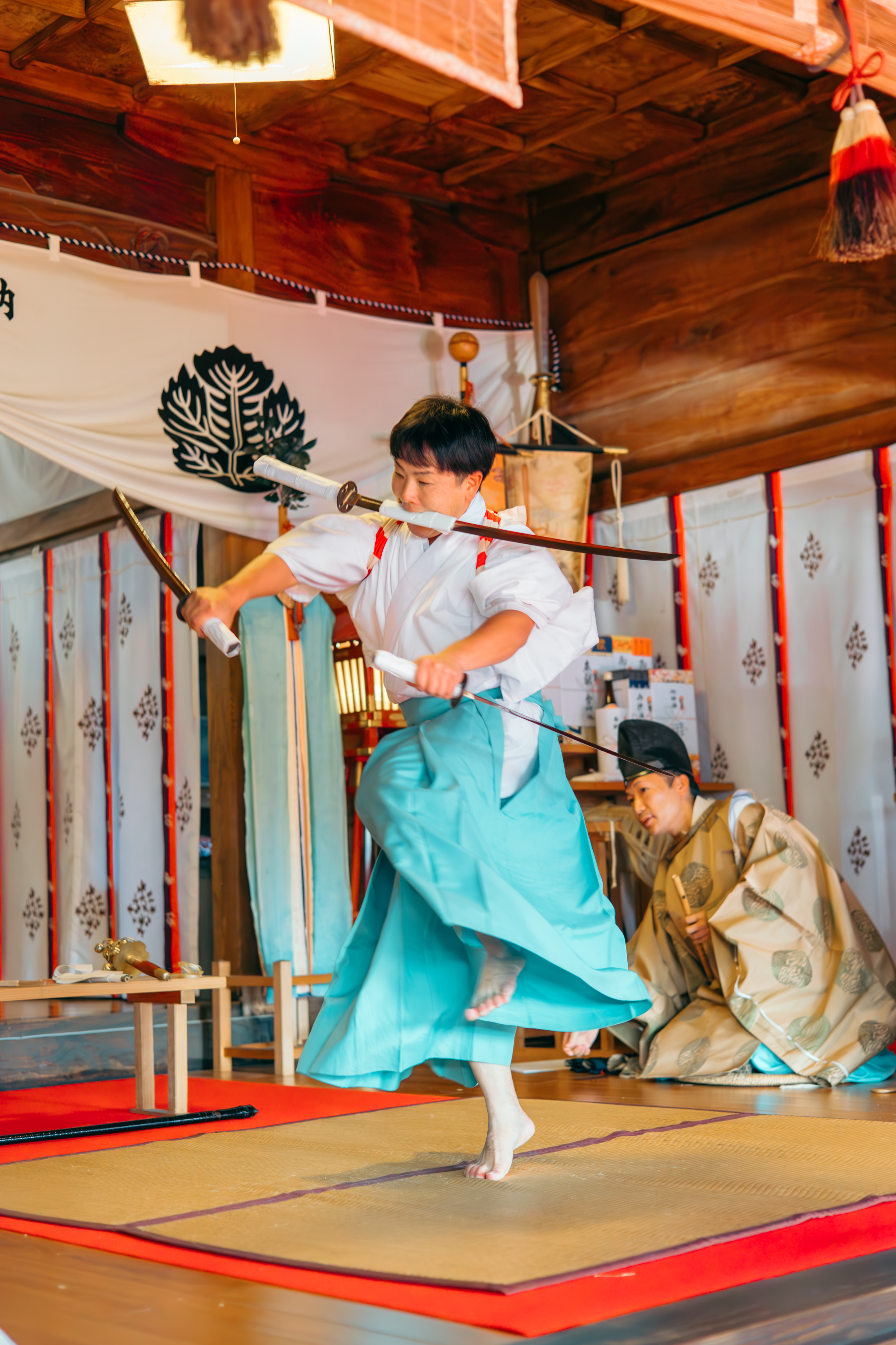 3.二(に)剣(けん):神職が真剣を抜き放ち、勇壮に舞う格式高い演目です。三振の真剣を用いた圧倒的な技は、邪気を祓うサムライ・スピリットの象徴でもあります。